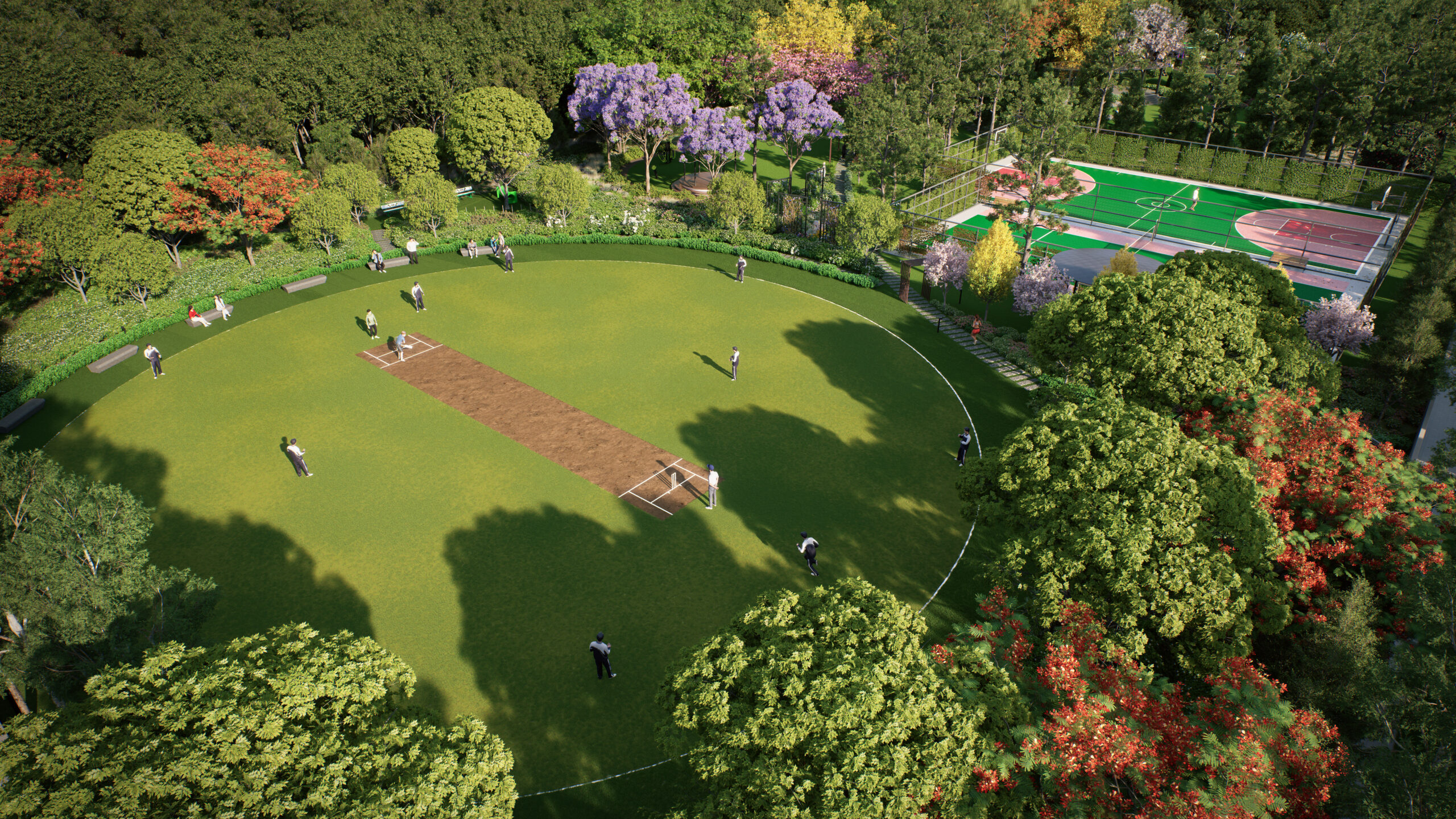 Cricket ground and multi-sports court surrounded by lush greenery at Codename Forest View